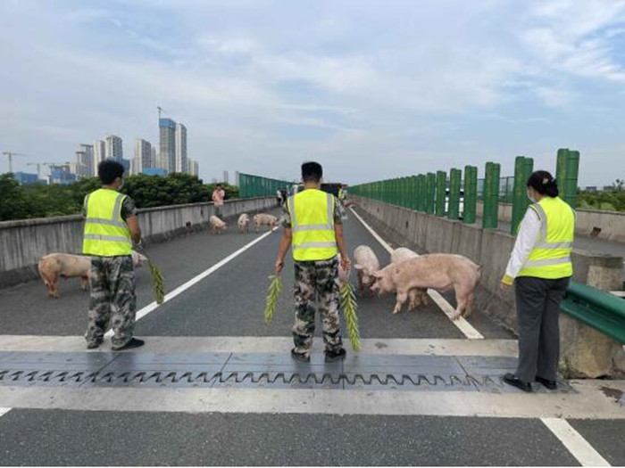收費班長見狀后立即上報值班人員,值班人員鐘志勛第一時間將事件上報至集控點,并通知在所員工到現(xiàn)場開展保暢工作,高警、路政、施救養(yǎng)護單位也趕到現(xiàn)場展開救援清障工作。19時左右,側翻的貨車被吊起,收費人員與高警、路政對收費現(xiàn)場疏堵保暢,當時不少生豬因從車廂摔落受到驚嚇在高速公路上四處亂竄,收費員魏子欽、胡波、賈曉磊等多名員工在確保自身安全的前提下,絲毫不敢懈怠,寸步不離的形成“人墻”,守著這些豬豬們在安全區(qū)域一直到另一輛轉運車到達現(xiàn)場。在最短的時間里讓收費道口恢復暢通,收費人員并做好司乘相關解釋工作。