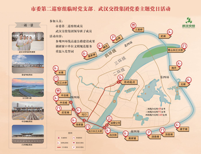 9月23日,市委第二巡察組臨時黨支部與武漢交投集團黨委聯(lián)合開展支部主題黨日活動。在市委第二巡察組組長吳明益,副組長劉國媛、高潔、劉杰的帶領下,巡察組全體成員參觀四環(huán)線高速公路建設成果,調研武漢交投集團窗口單位文明規(guī)范服務情況。武漢交投集團黨委書記、董事長毛愛方,黨委副書記、紀委書記楊凡,黨委委員、副總經理胡奇文,集團總工程師王愛民等陪同調研。