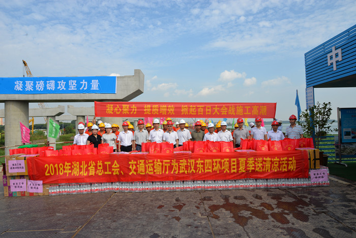 驕陽似火,熱浪襲人。7月26日,湖北省總工會(huì)黨組成員、副主席李春舫在省交通運(yùn)輸廳工會(huì)副主任江飛、省交通運(yùn)輸廳重點(diǎn)建設(shè)辦副主任徐建明一行的陪同下,來到武漢交投集團(tuán)東四環(huán)線項(xiàng)目建設(shè)工地,看望慰問高溫下堅(jiān)守在重點(diǎn)工程建設(shè)一線的產(chǎn)業(yè)工人,向他們送去夏日里的一片“清涼”。武漢交投集團(tuán)黨委副書記、總經(jīng)理陳順平,黨委副書記、紀(jì)委書記楊凡,集團(tuán)總經(jīng)理助理、東四環(huán)公司總經(jīng)理王先強(qiáng)參加了慰問活動(dòng)。