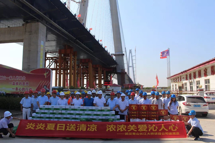 青山橋公司開展“炎炎夏日送清涼,濃濃關愛沁人心”為主題的“送清涼”活動。在青山長江大橋施工現場,公司總監(jiān)李朝陽、總經理助理胡永勝把防暑降溫用品送給一線產業(yè)工人手中,將關懷送到全體員工心里;