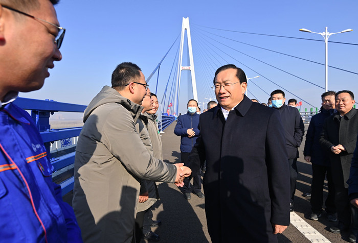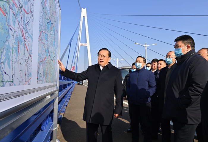 湖北省委常委、武漢市委書記王忠林,市委副書記、市長周先旺一行來到青山長江大橋,實地檢查四環(huán)線主線貫通情況。