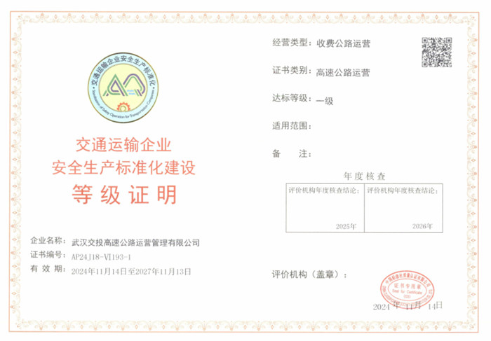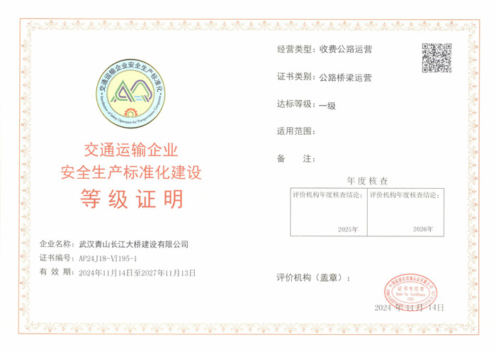 近日,交投集團(tuán)青山長(zhǎng)江大橋公司、高速公路運(yùn)營(yíng)公司雙雙通過(guò)交通運(yùn)輸企業(yè)安全生產(chǎn)標(biāo)準(zhǔn)化達(dá)標(biāo)認(rèn)證考核,喜獲“交通運(yùn)輸企業(yè)安全生產(chǎn)標(biāo)準(zhǔn)化建設(shè)等級(jí)一級(jí)證書”,標(biāo)志著集團(tuán)安全生產(chǎn)管理“標(biāo)準(zhǔn)化、規(guī)范化、精細(xì)化”管理邁上新臺(tái)階。